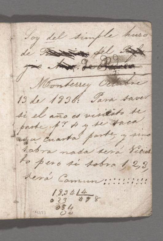The legible writing on this final page begins with a reference to Monterey, Alta California (Monterey, California today) using an alternate double-r spelling common in mid 1800s Spanish. After the date, October 13th of 1836, the author goes on to describe how to determine if a given year is a leap year using mathematics.