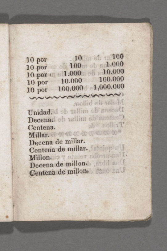 Before tackling complex calculations, students learned the decimal system through clear, progressive tables showing multiplication by 10. This page then demonstrates place values from Unidad (ones) through Centena de millón (hundred millions).