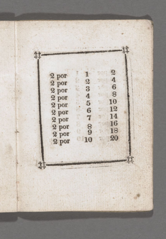 The heart of mathematical education: multiplication tables. This page shows the 2-times table in a decorative bordered frame, demonstrating how even basic drills were presented with aesthetic consideration.