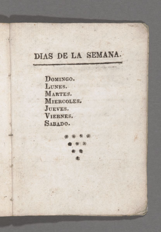Every student needed to know the days of the week. This elegant page lists them in Spanish: Domingo through Sábado, with decorative asterisks adding visual interest to the lesson.