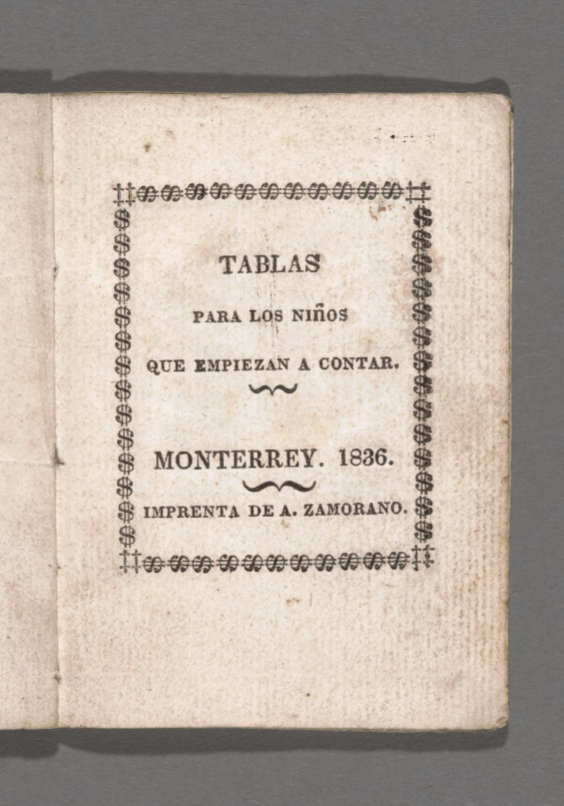 Printed with elegant typography and decorative borders, the title page announces: “TABLAS PARA LOS NIÑOS QUE EMPIEZAN A CONTAR” (Tables for Children Who Are Beginning to Count). Published in Monterrey, 1836, by Imprenta de A. Zamorano.